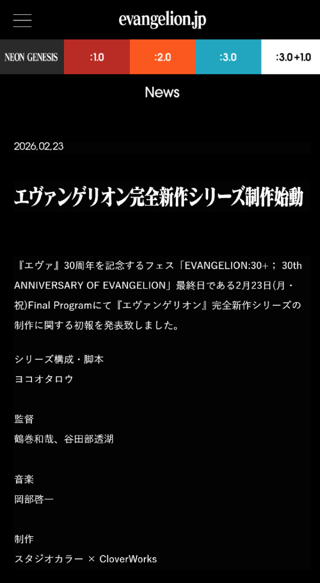 《Evagelion》系列完全新作动画制作决定